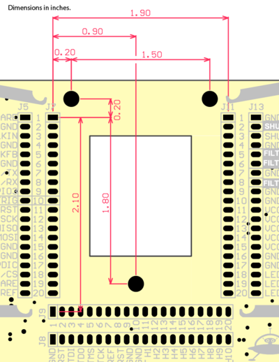 The "victim board" fits into three 20-pin female headers. They provide both electrical and mechanical connections for the board. There is optional mounting holes which can be used if additional mechanical support is required (especially if you need a locked-down victim for use with an EM probe).